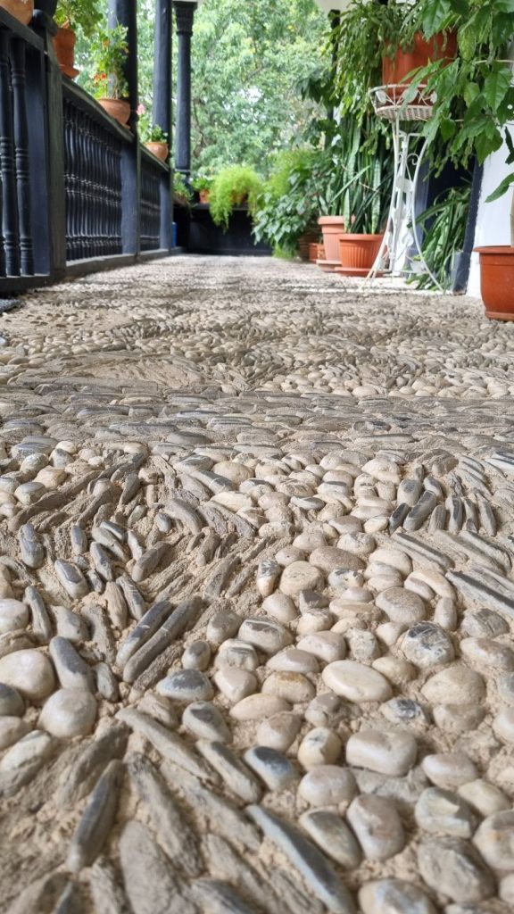 Să remarci neapărat podeaua terasei conacului, un mozaic ingenios. E originalul, alcătuit din piatră de râu și teracotă.